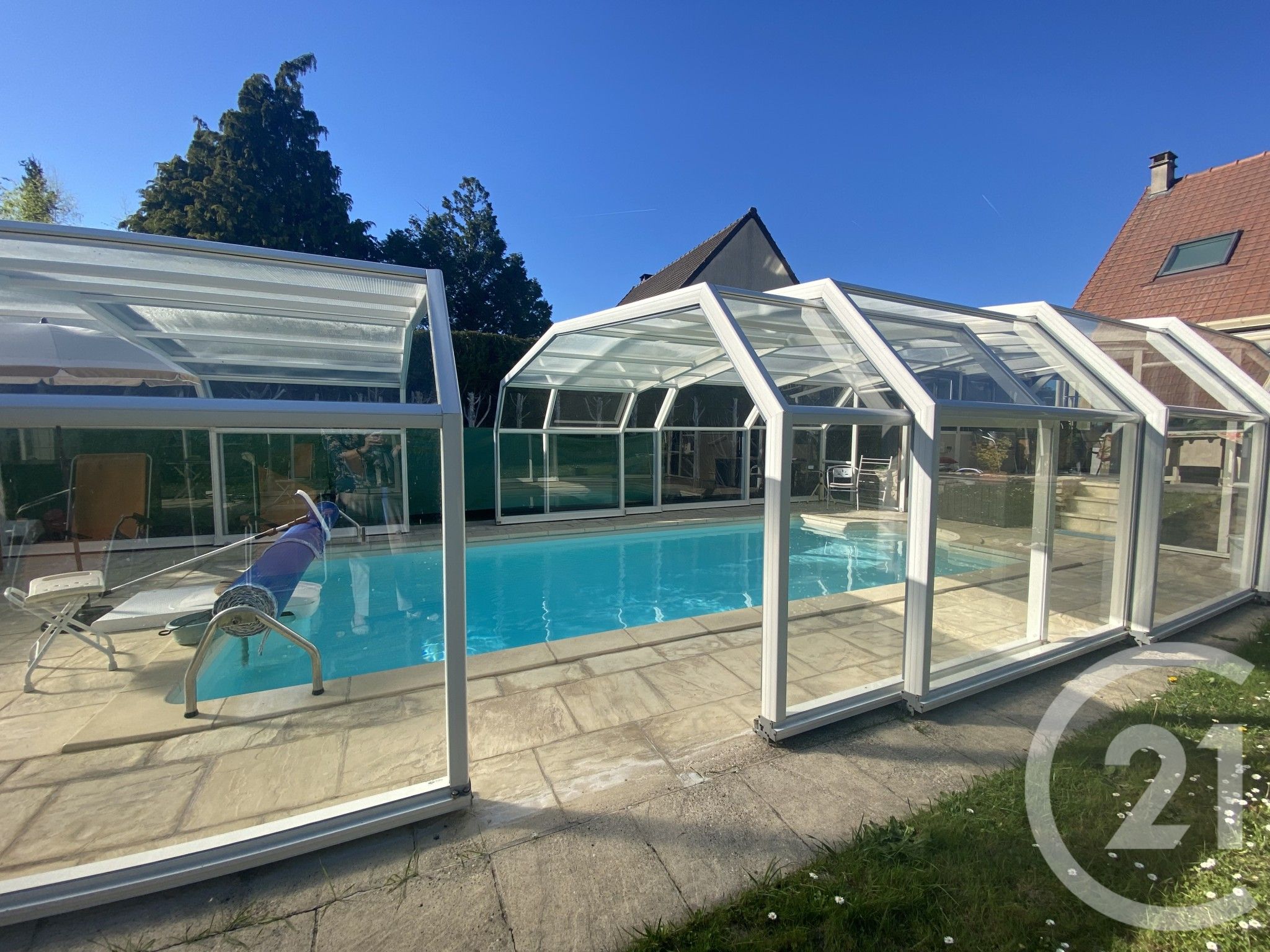 Piscine chauffée (3.5 mètres x 7.5 mètres), attenante à la maison, avec toiture mobile de 3 mètres de hauteur, idéale pour nager toute l'année. Chalet en dur au fond du jardin, avec électricité et eau froide et chaude.